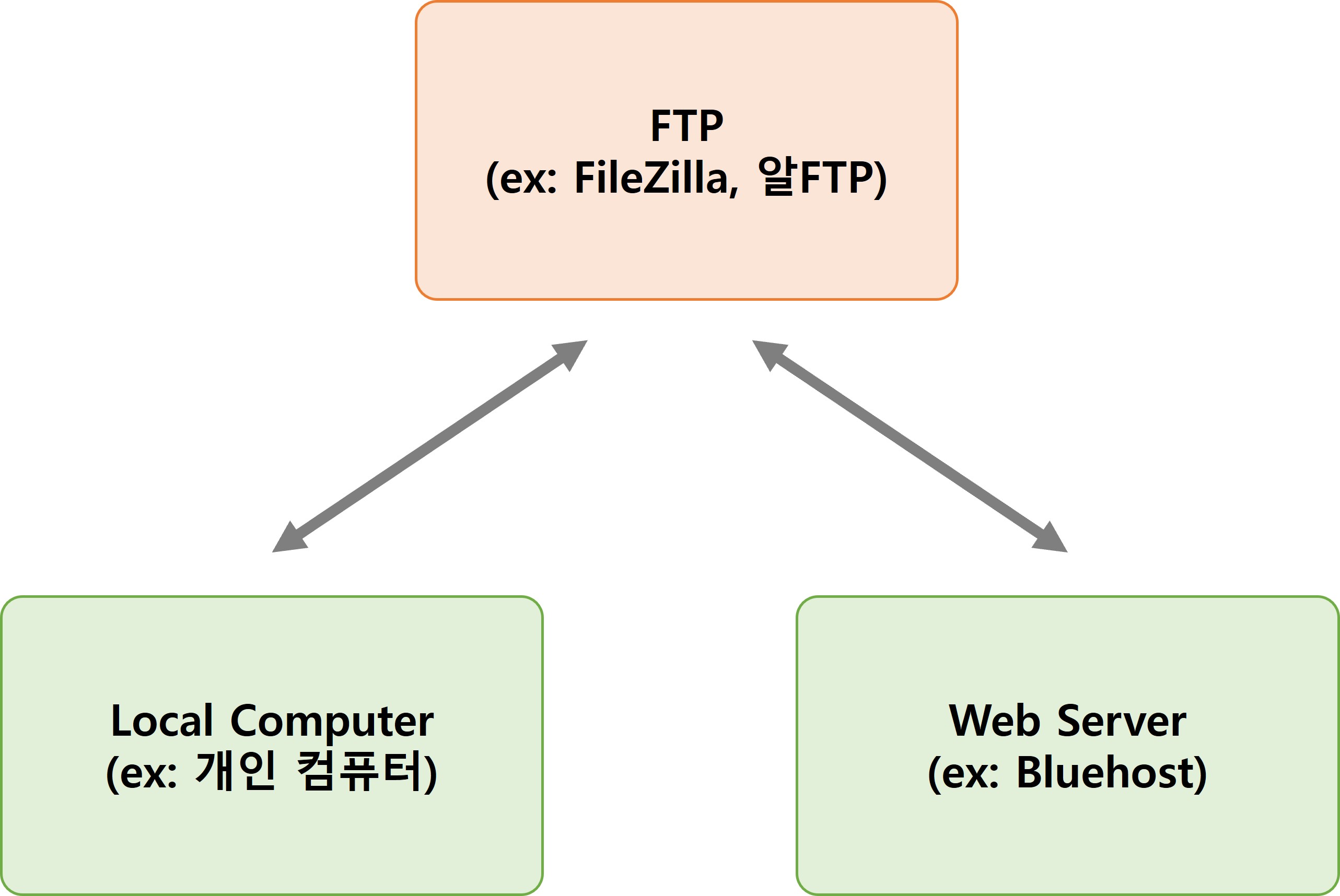 파일질라(filezilla)는 파일 전송 프로그램(FTP, File Transfer Protocol) 중 하나다. FTP는 개인 컴퓨터와 웹서버간에 파일을 전송하기 위해 필요하다. 이 의미를 간단하게 도식화 시키면 아래 그림과 같이 나타낼 수 있다. 예를 들어, 현재 내 웹사이트의 디자인을 변경하고 싶다고 하자. 그러면 웹상에서 바로 수정해도 되지만, 개인 컴퓨터에서 수정을 하고 FTP 프로그램을 이용해 웹서버로 수정된 디자인을 보내게 되면 작업 속도가 빨라질뿐만 아니라 훨씬 편하게 이용할 수 있다.