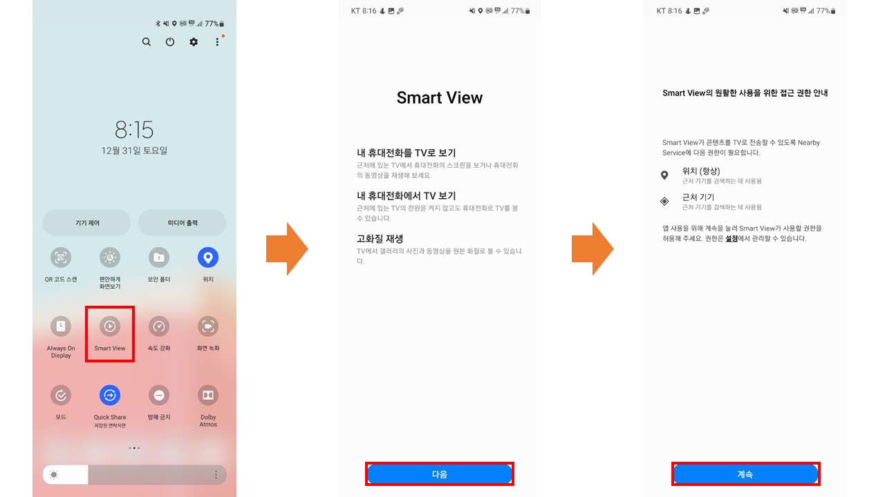 4. 다음은 스마트폰의 상단바를 내려서 Smart View 아이콘을 눌러준 후에, 다음 - 계속을 눌러줍니다.