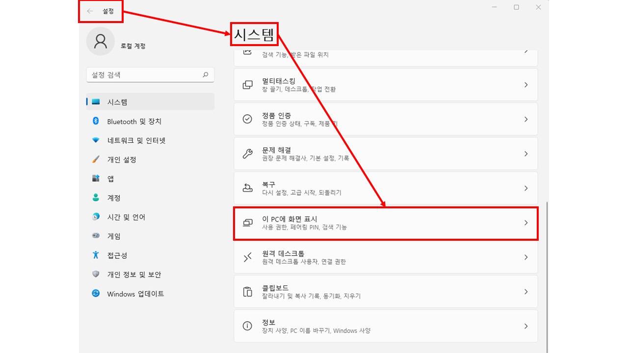 1. 윈도우 검색창에서 설정창을 열어, [설정 -> 시스템 -> 이 PC에 화면 표시]로 들어가줍니다.