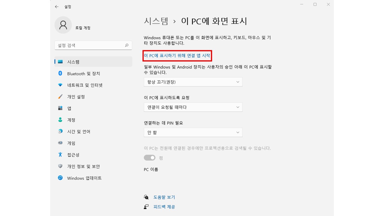 2. 이 PC에 표시하기 위해 연결 앱 시작을 눌러줍니다.