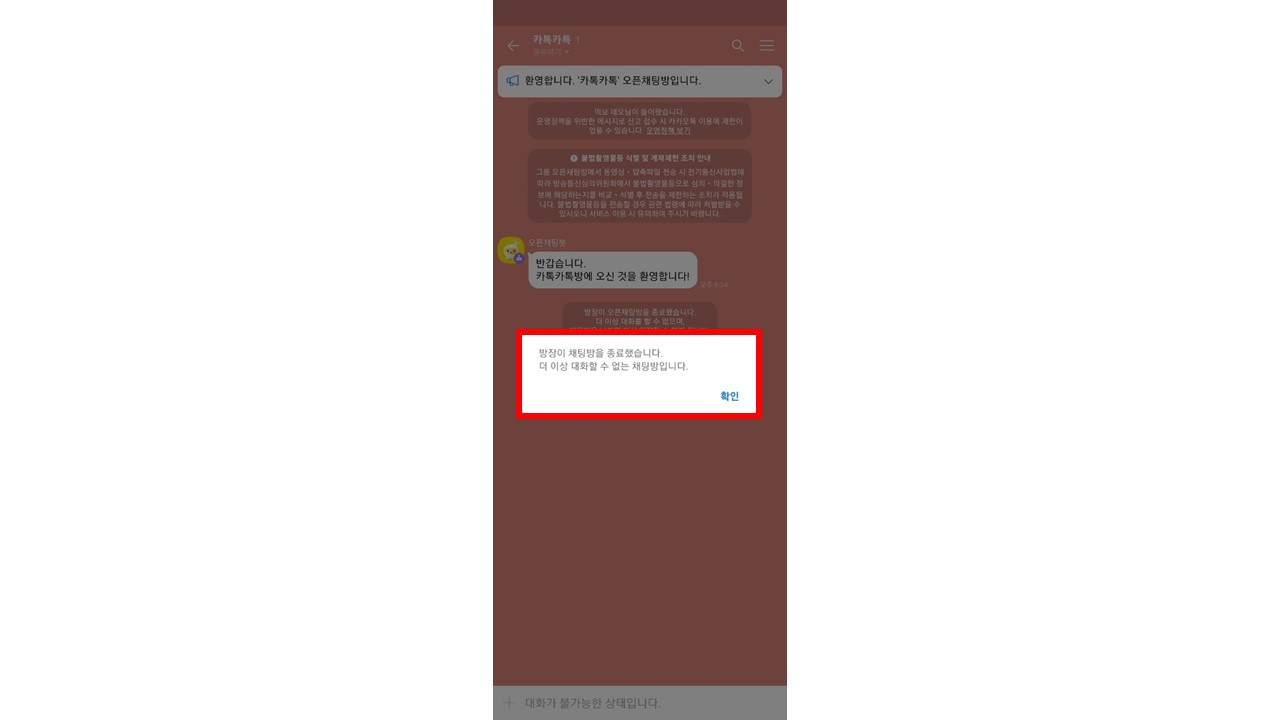 STEP 6. 방장이 아닌 다른 사람이 오픈채팅방에 들어가면 다음과 같이 팝업팡이 뜨게 되고, 이 오픈채팅방은 더 이상 사용할 수 없게 된다.