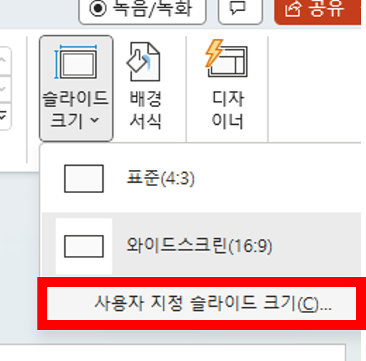 STEP 2. 그럼 아래와 같이 나오는데 사용자 지정 슬라이드 크기를 눌러주자.