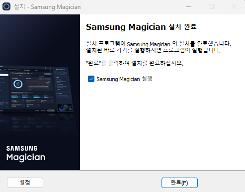3. 다운로드한 파일을 통해 삼성 매지션을 설치하고 설치가 완료되면 완료 버튼을 눌러준다.