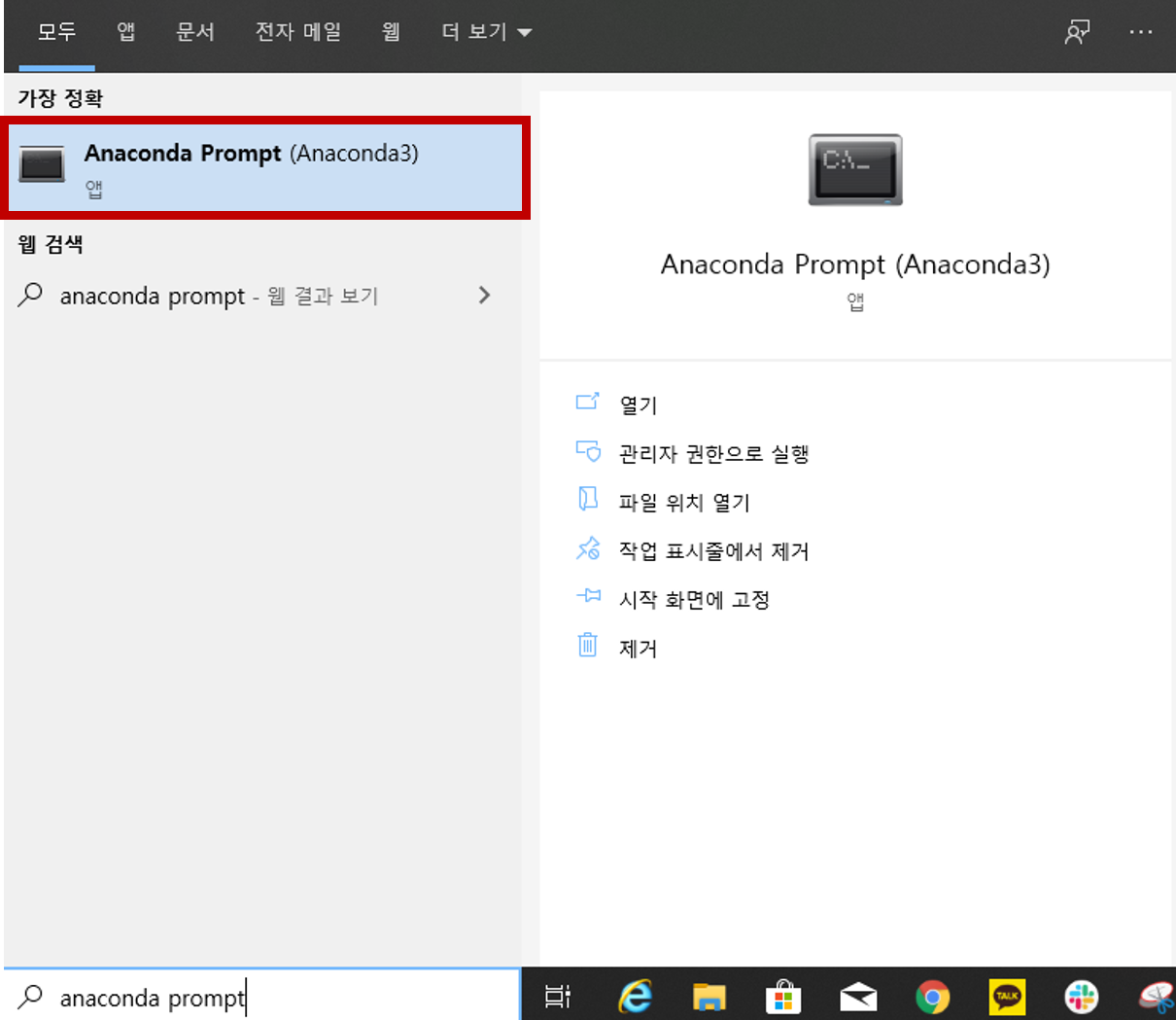 설치가 완료 되었는지 확인하기 위해서는 검색에서 anaconda를 입력하시면 확인하실 수 있습니다.