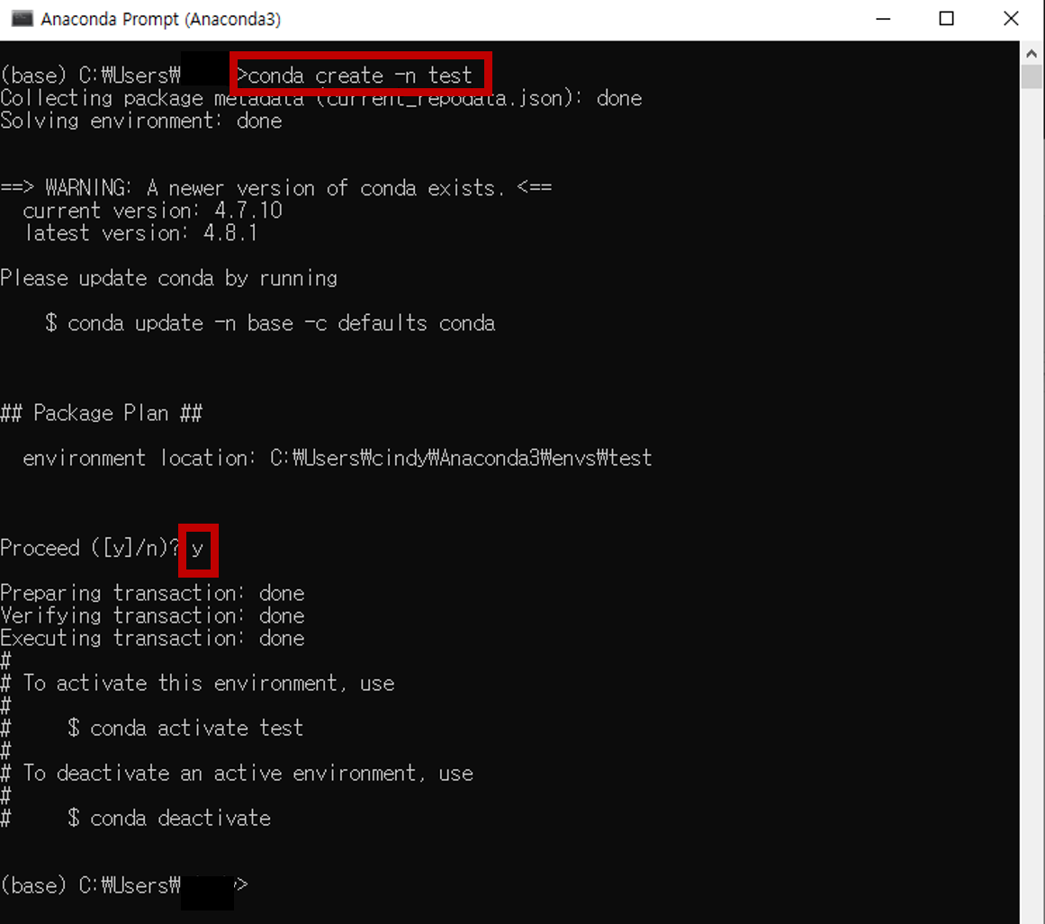 저는 test라는 가상환경을 만들었으니 conda activate test라고 쓰고 엔터를 치면 제가 만든 test라는 가상환경에 진입하게 됩니다. 원래 (base)였는데 (test)로 바뀐 것을 확인할 수 있습니다. 만약 test라는 가상환경에서 작업을 진행하고 싶으시다면 (test)라고 되어있는지 확인하고 작업을 진행하시면 됩니다.