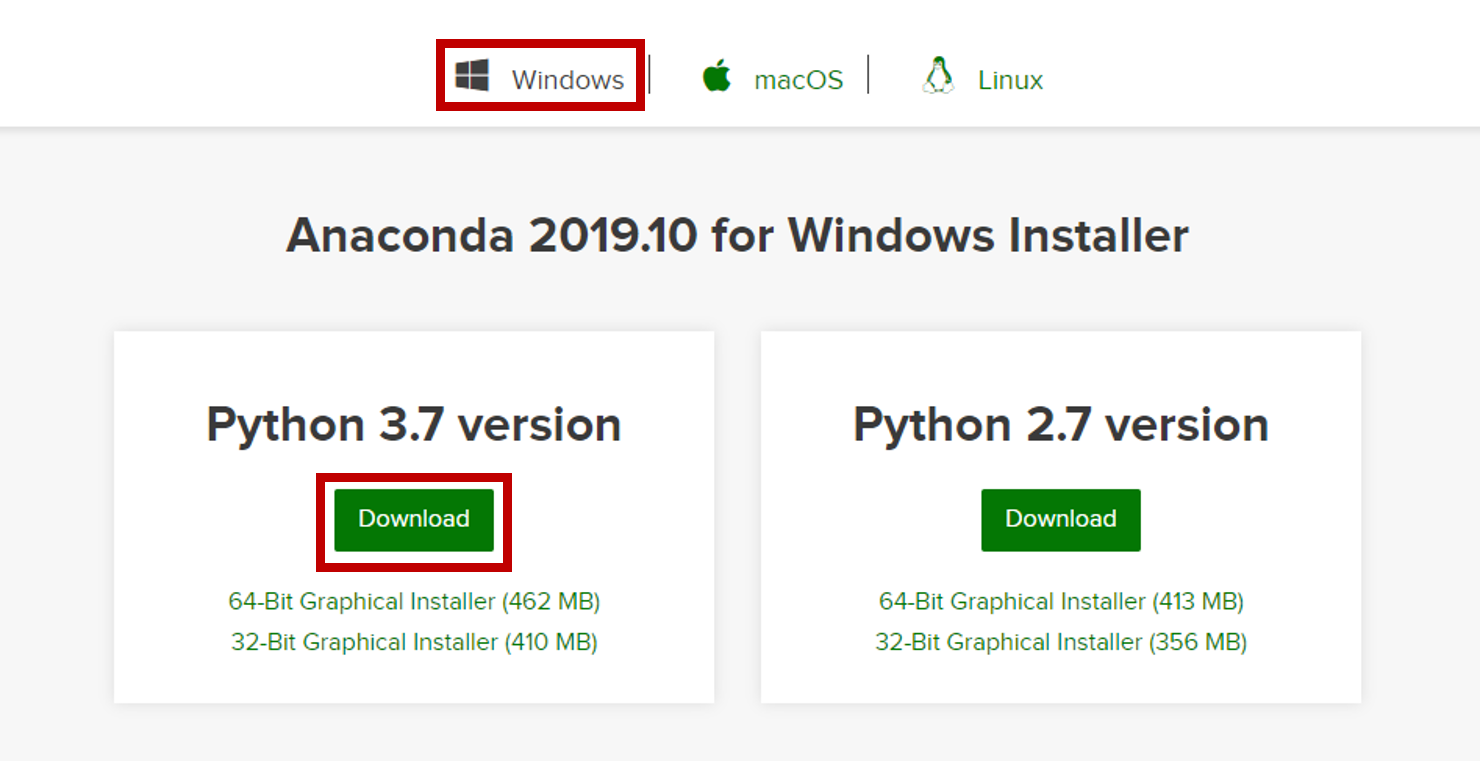 링크를 따라 아나콘다 홈페이지에 접속을 하게 되면 아래와 같은 화면은 보실 수 있습니다. 자신이 현재 사용하고 있는 운영체제를 설정 후 다운로드 하시면 됩니다. 저는 윈도우를 사용하기 때문에 윈도우로 설정 후 다운로드 하겠습니다.