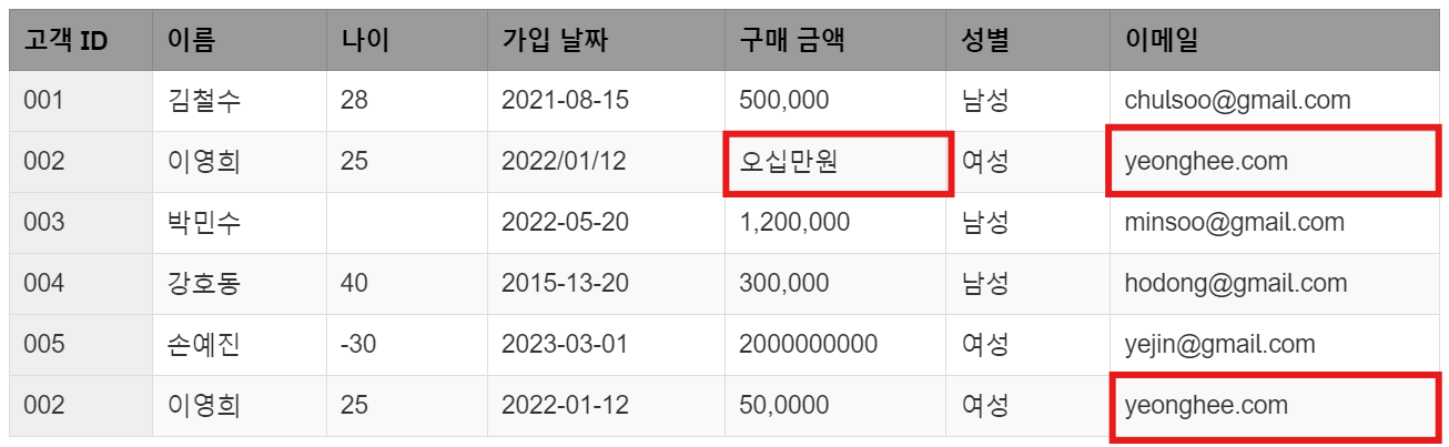 이영희(002번 고객)의 구매 금액이 '오십만원'이라는 한글로 입력되어 있습니다. 다른 고객들의 구매 금액은 숫자로 입력되어 있지만, 이 경우는 텍스트로 입력되어 있어 분석 시 텍스트를 숫자로 변환해야 하는 추가 작업이 필요합니다. 또한, 이영희의 이메일 주소는 @가 누락되어 있습니다. 이메일 주소 형식이 잘못되면 해당 고객과 연락하는 데 문제가 발생할 수 있습니다.