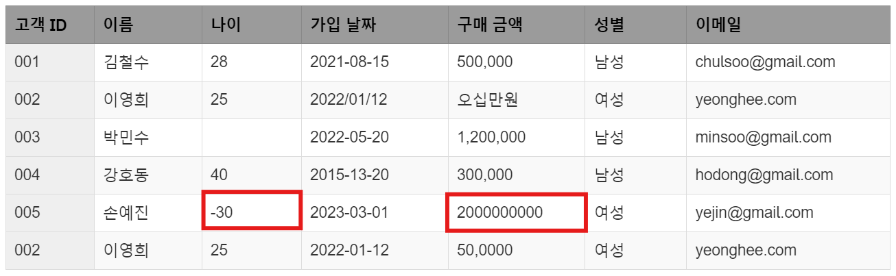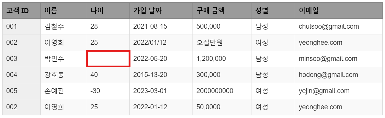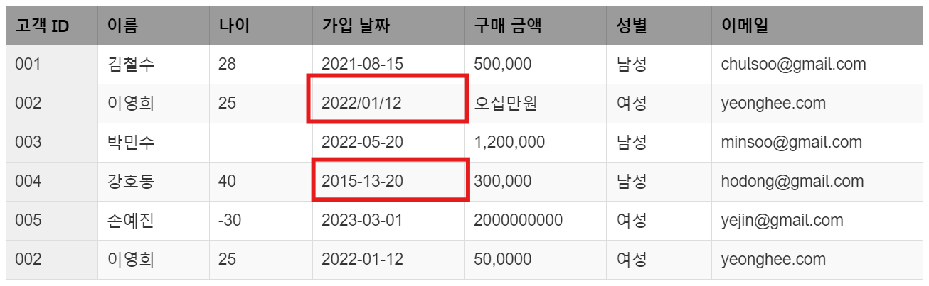 이영희(002번 고객)의 가입 날짜가 2022/01/12로 다른 고객의 YYYY-MM-DD 형식과 다르게 입력되어 있습니다. 날짜 형식의 불일치는 시간 기반 분석이나 정렬에 문제를 일으킬 수 있습니다. 또한 강호동(004번 고객)의 가입 날짜가 2015-13-20으로 입력되었는데, 13월은 존재하지 않는 날짜입니다. 이런 경우, 날짜 형식을 일관되게 맞추고 비현실적인 날짜를 수정하는 작업이 필요합니다.