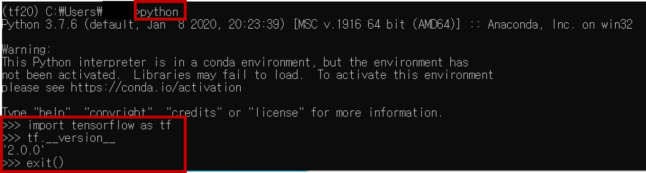 그리고 조금 기다리면 설치가 완료되고, 제대로 설치되었는지 확인해보겠습니다. 먼저 아래와 같이 python을 입력해주신 후에 아래와 같이 텐서플로를 임포트 해줍니다. 그리고 텐서플로 버전을 확인하면 2.0.0으로 잘 설치되신 것을 확인할 수 있습니다. 확인 작업을 마친 후에 나가려면 exit() 또는 quit()을 입력하시고 엔터를 치면 됩니다.
