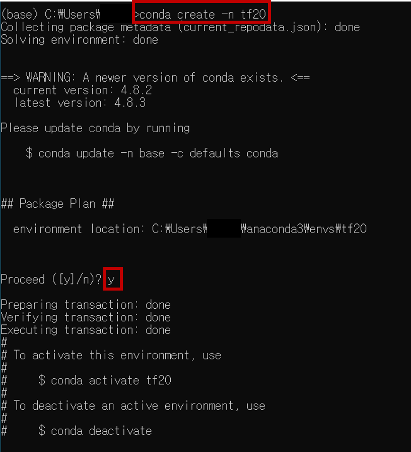 그럼 아래와 같이 입력해서 tf20이라는 가상환경을 만들어주겠습니다. 중간에 계속 진행할지 여부를 물어보는데, y를 입력하고 엔터를 쳐줍니다. 아래 두 방법 모두 사용가능한데요, 아래 방법은 설치하고 싶은 파이썬 버전을 뒤에 명시해주시면, 명시한 버전으로 설치가 됩니다.
