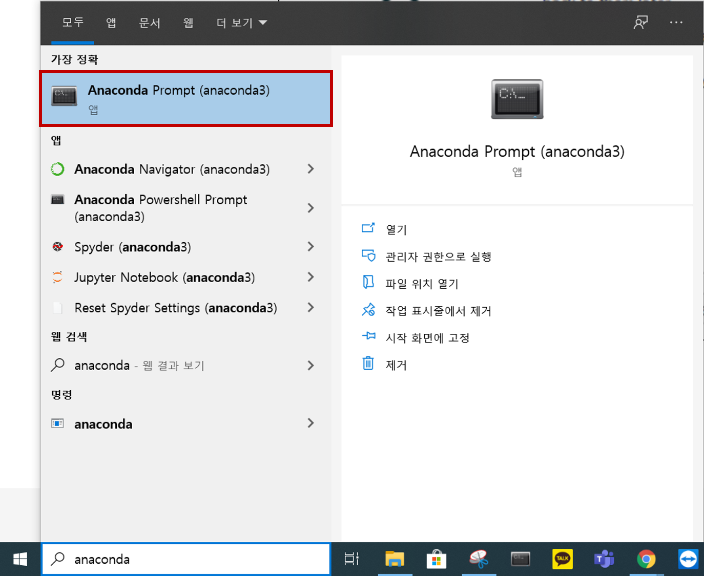 자, 그럼 이제 아나콘다 설치가 완료되었고 검색창에 anaconda를 입력하시면 다음과 같이 Anaconda Prompt가 나오게 됩니다. 이걸 눌러주세요.