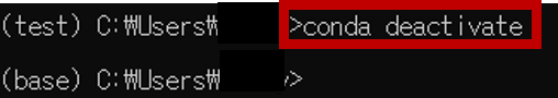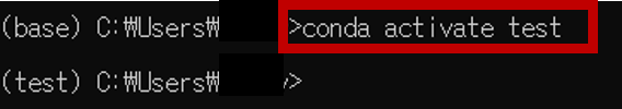 저는 test라는 가상환경을 만들었으니 conda activate test라고 쓰고 엔터를 치면 제가 만든 test라는 가상환경에 진입하게 됩니다. 원래 (base)였는데 (test)로 바뀐 것을 확인할 수 있습니다. 만약 test라는 가상환경에서 작업을 진행하고 싶으시다면 (test)라고 되어있는지 확인하고 작업을 진행하시면 됩니다.