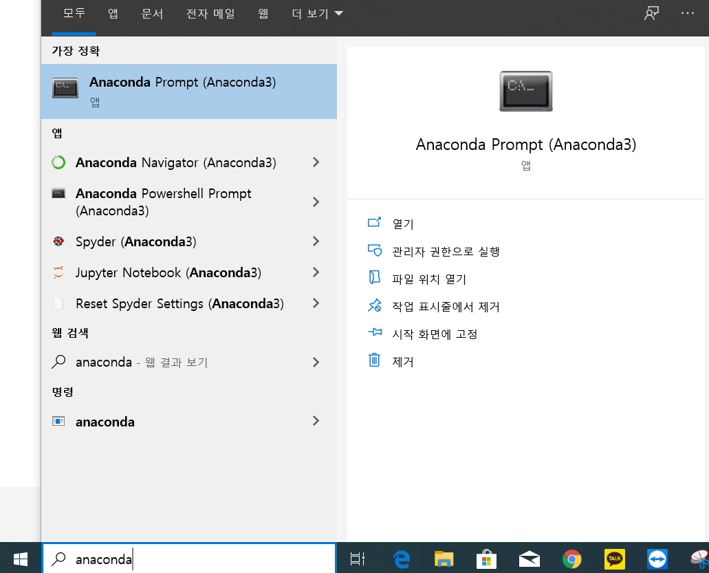 설치가 완료 되었는지 확인하기 위해서는 검색에서 anaconda를 입력하시면 확인하실 수 있습니다.
