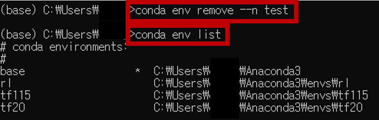 마지막으로 만들어둔 가상환경이 필요없어져 삭제하고 싶으면 아래와 같이입력해서 가상환경을 삭제할 수 있습니다. 저는 위에서 만든 test라는 가상환경을 삭제해보도록 하겠습니다.