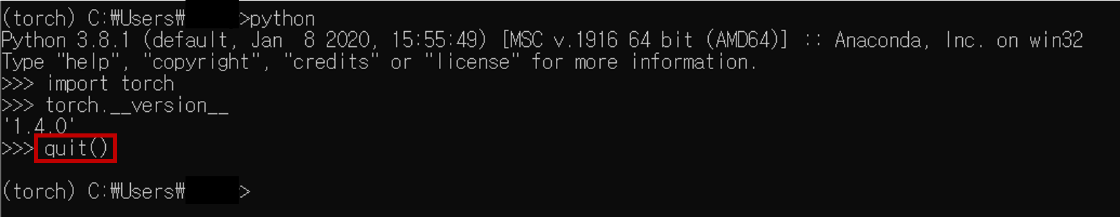 자신의 파이토치 버전을 확인 후 종료하고 싶으면 quit()을 입력하고 엔터를 치면 나올 수 있습니다.