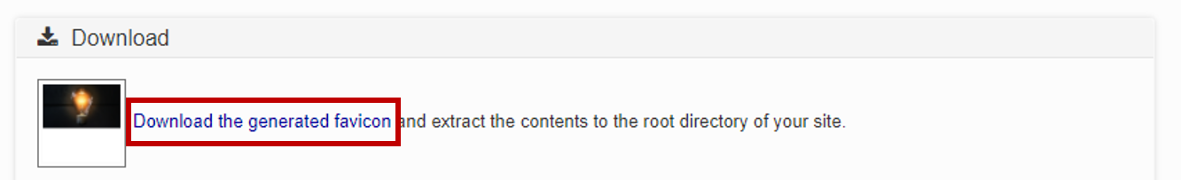 그럼 시간이 조금 경과된 뒤에 아래와 같은 화면이 나오게 됩니다. 여기서 Download the generated favicon을 눌러주세요.