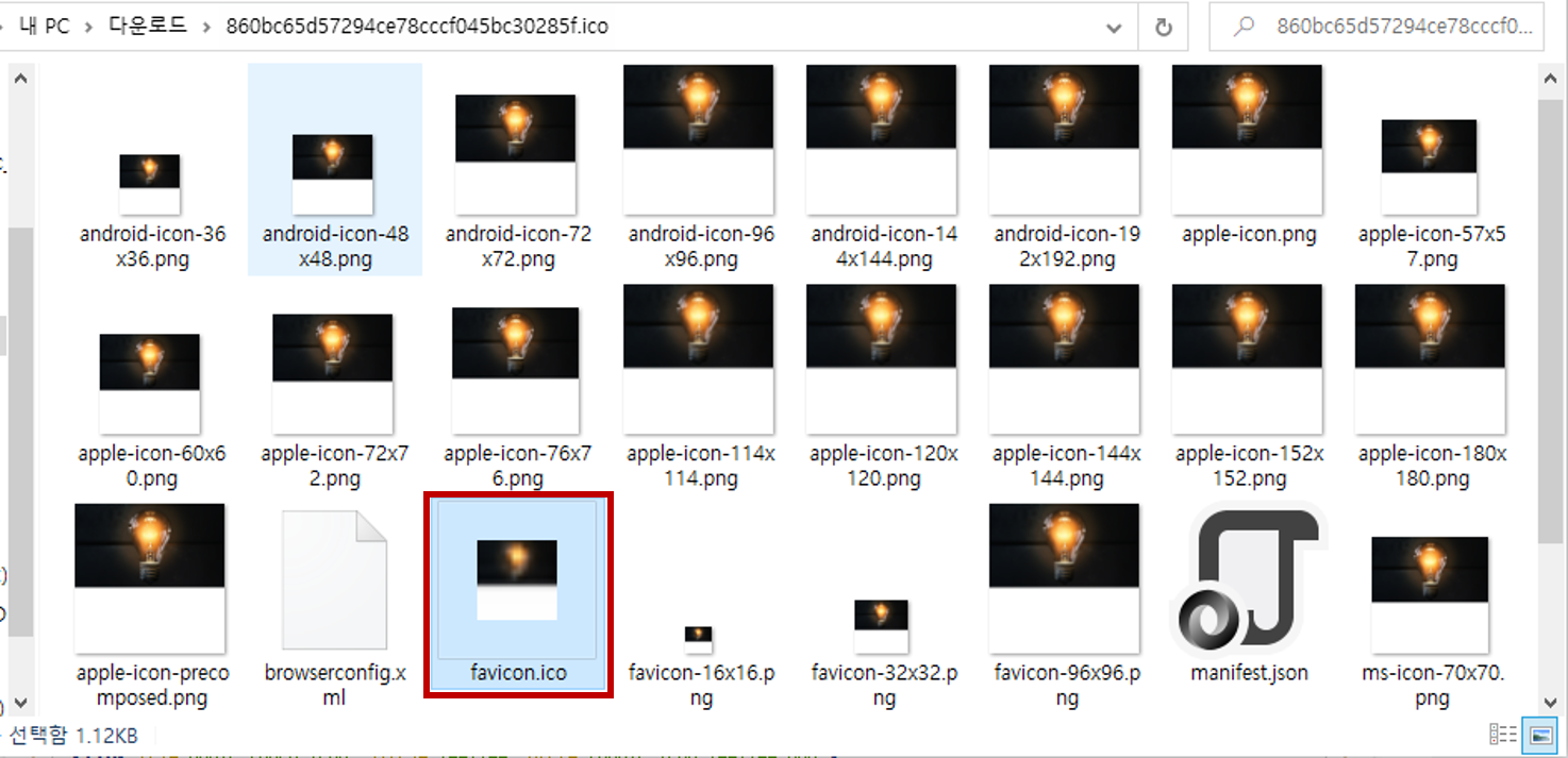 압축 풀기가 완료되면 아래와 같이 여러 이미지 파일들을 볼 수 있는데요. 여기서 빨간색 네모 박스친 파비콘 파일도 볼 수 있습니다.