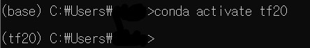 먼저 텐서플로 2.0을 설치할 tf20이라는 가상환경을 하나 만들어줍니다. 가상환경을 생성했다면 활성화하여 가상환경 내부로 들어가줍니다. 그럼 (base)라고 되어 있던 부분이 (tf20)으로 바뀐 것을 확인할 수 있고, 이것은 제가 생성한 (tf20)이라는 가상환경에 들어왔음을 나타냅니다.