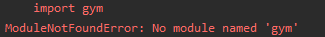 No module named 'gym' 이라는 오류가 발생한다면 현재 디렉토리에 gym이 설치되어 있지 않아서입니다. 다음과 같은 오류가 뜰 경우는 gym을 설치해주기만 하면 해결이 됩니다.