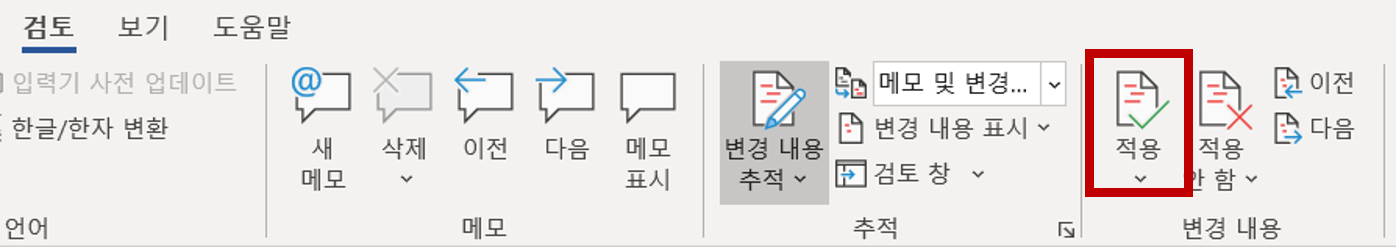 변경된 내용이 적용된 최종본을 적용하는 방법은 [검토] → [변경 내용] → [적용] →[변경 내용 모두 적용]을 눌러주시면최종본 상태가 됩니다. 그런 다음 저장(Ctrl + s)하면 최종본으로 저장이 됩니다.