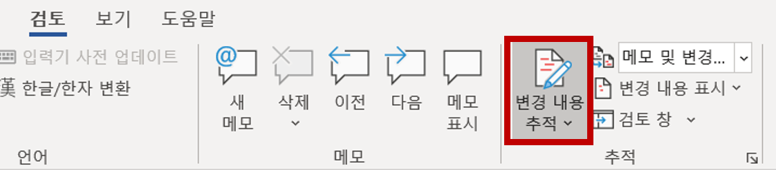 먼저 변경 내용 추적하는 방법은 다음과 같습니다. [검토] → [추적] → [변경 내용 추적]을 눌러주시면됩니다.