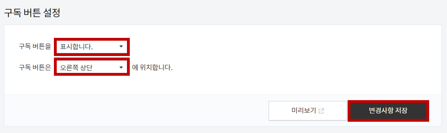 그러면 메뉴바와 구독 버튼 설정을 하는 페이지가 나오게 되는데요. 여기서 구독 버튼을 표시합니다로 바꾸어줍니다. 그럼 아래에 구독버튼을 어디에 위치할건지 설정하는 부분이 나오게 됩니다. 저는 오른쪽 상단에 위치하도록 설정하겠습니다. 위치는 오른쪽 상단, 오른쪽 하단, 오른쪽 가운데, 왼쪽 하단으로 4가지 선택권이 있습니다. 자신이 원하는 위치에 설정해줍니다. 설정이 완료되면 변경사항 저장을 눌러줍니다.