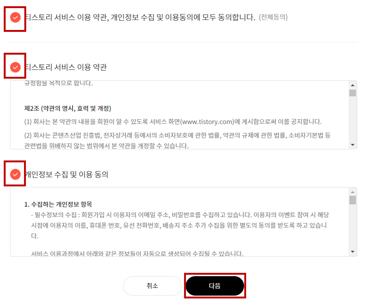 가입하기를 누르면 다음 화면이 나오게 됩니다. 모두 체크를 해주시고 다음 버튼을 눌러주세요.