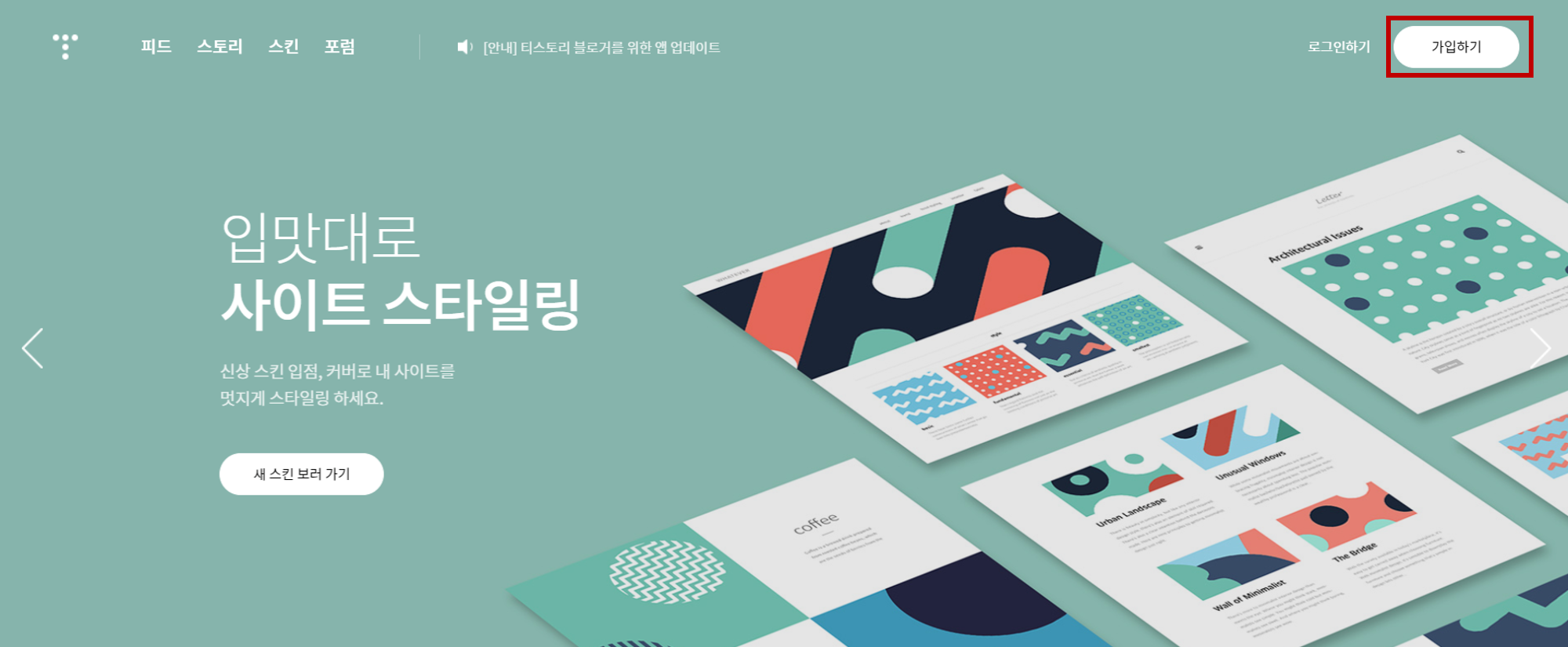 티스토리 홈페이지에 들어가면 제일 처음 나오는 화면은 다음 화면일텐데요. 우리는 여기서 오른쪽 상단에 있는 가입하기를 클릭합니다.
