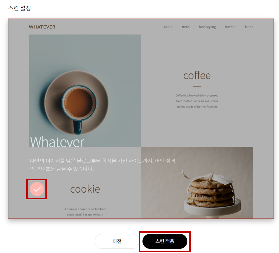 다음 버튼을 누르게 되면 스킨 설정을 하시면 됩니다. 저는 Whatever라는 스킨을 사용하였는데, 각자 사용하고 싶은 스킨을 선택하고 스킨 적용 버튼을 눌러주시기 바랍니다.