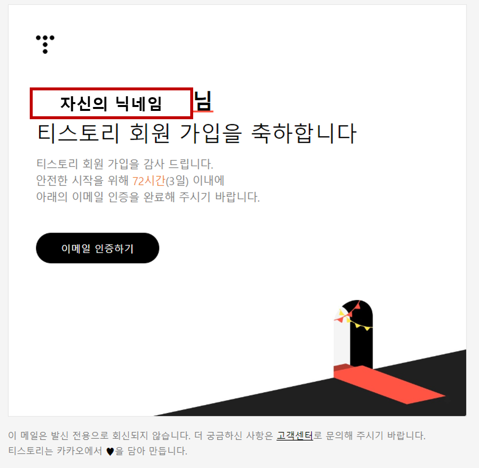 메일함에 들어가보면 티스토리로부터 다음과 같은 메일이 와 있을겁니다. 네모 박스 친 부분은 회원 가입 할 때 기입했던 자신의 닉네임입니다. 이메일 인증하기를 클릭해줍니다.